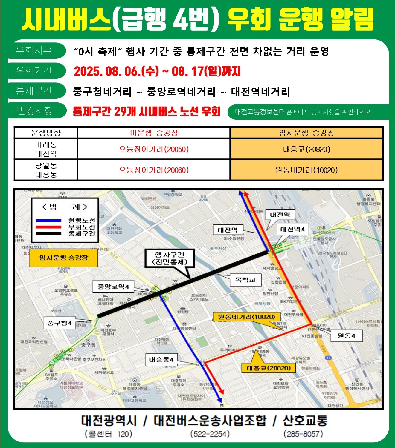 2025 대전0시축제 기간 중 급행 1번, 급행 2번, 급행 3번이 임시 우회 운행됩니다. 8월 6일(수) 첫차부터 8월 17일(일) 막차까지 중앙로 구간을 우회하여 우암로, 대전로, 보문로, 대흥로를 경유해 운행하게 됩니다.